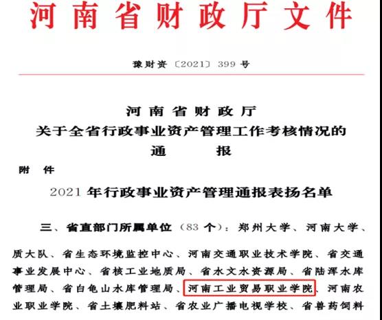 近日,河南省财政厅公布了《关于全省行政事业资产管理工作考核情况的通报》(豫财资〔2021〕399号),对郑州市财政局等18个市县财政局、省政府办公厅等33个省直部门、郑州大学等83个省直部门所属单位给予通报表扬。太阳成tyc7111cc在省直部门所属单位表扬名单之列。