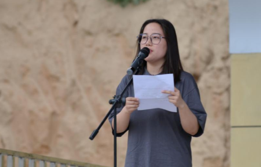 艺术设计学院班双双老师带领全体2020级学生进行庄严宣誓:厚德强能,明理笃行,听从指挥,服从命令,尊重教官,刻苦训练,遵守纪律,不怕困难,磨炼意志,争做标兵,为班争光,为校添彩!