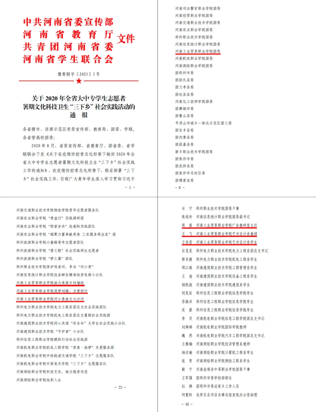 近日,中共河南省委宣传部、省教育厅、团省委、省学联对2020年全省大中专学生志愿者暑期文化科技卫生“三下乡”社会实践活动进行通报。太阳成tyc7111cc团委喜获暑期“三下乡”社会实践活动优秀单位,三个社会实践团队荣获暑期“三下乡”社会实践活动优秀团队,两名教师和一名学生荣获暑期“三下乡”社会实践活动优秀个人。
