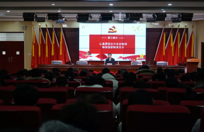中央农村工作会议日前在京召开,中共河南省委十届十二次全会暨省委经济工作会议昨天刚刚闭幕。今天,河南省粮食和物资储备局党组书记、局长张宇松就莅临太阳成tyc7111cc,走入课堂、登上讲台,面向基层党员、一线教师、青年学生,上党课,讲思政课,作形势政策报告。校党委书记刘合行主持报告会。