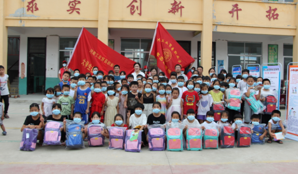 讲座结束后,院团委向刘楼乡无咎屯村小学贫困学生捐赠发放了书包60个、文具60套和图书。