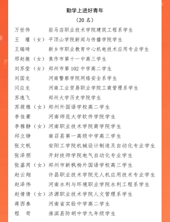 4月29日,获评名单公布,我院推荐报送的工商管理系18工商103班闫应龙同学荣获2020年“新时代河南向上向善好青年”称号,被评为勤学上进好青年。