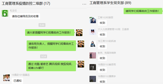 工商管理系及时向全体老师和入党积极分子发出观看两会直播的通知,同时要求全系未返校的学生及时关注观看政府工作报告直播。