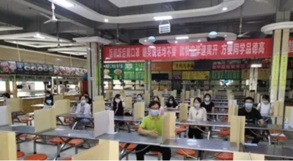 保障安全“放心餐”,进行洗手消毒,接受体温检测,体温正常者依次进入食堂,就餐时单人单桌、同向就坐。