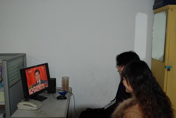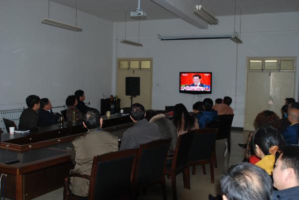在学院办公楼大会议室,学院领导与学院中层领导干部一起,认真聆听了胡锦涛总书记代表第十七届中央委员会所作的题为《坚定不移沿着中国特色社会主义道路前进 为全面建成小康社会而奋斗》的报告。