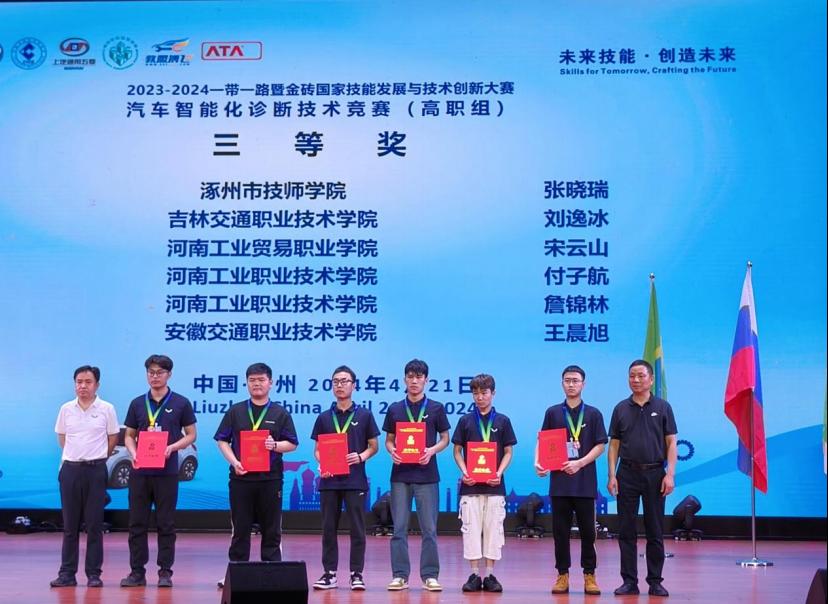 “未来技能·创造未来”。4月20日,2023-2024“一带一路”暨金砖国家技能发展与技术创新大赛在柳州城市职业学院隆重开幕。太阳成tyc7111cc获得汽车智能化诊断技术项目国赛三等奖。