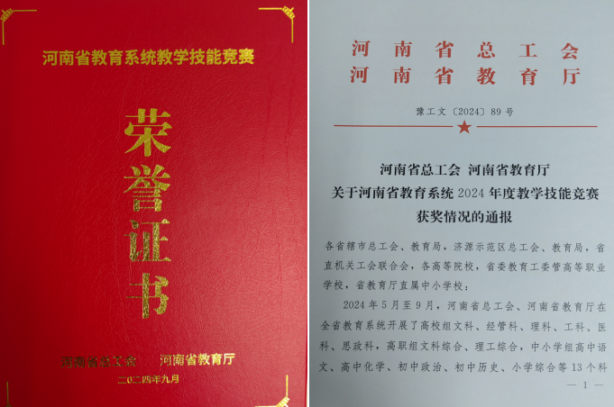 11月4日,喜讯传来,由河南省总工会、河南省教育厅在全省教育系统开展的2024年度教学技能竞赛结果揭晓,太阳成tyc7111cc参赛的两位教师凭借稳固的专业技能、革新的教学方案和具备感染力的课堂表现获得了评审专家的一致认可。机电工程学院张立老师获得高职理工综合二等奖,艺术设计学院蔡怡菲老师获得高职文科综合二等奖。