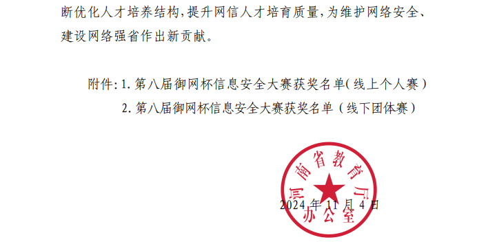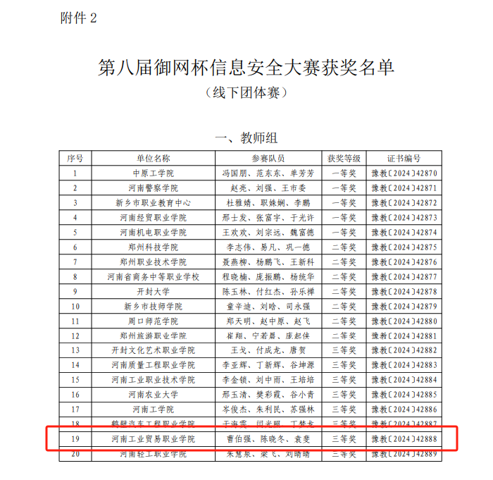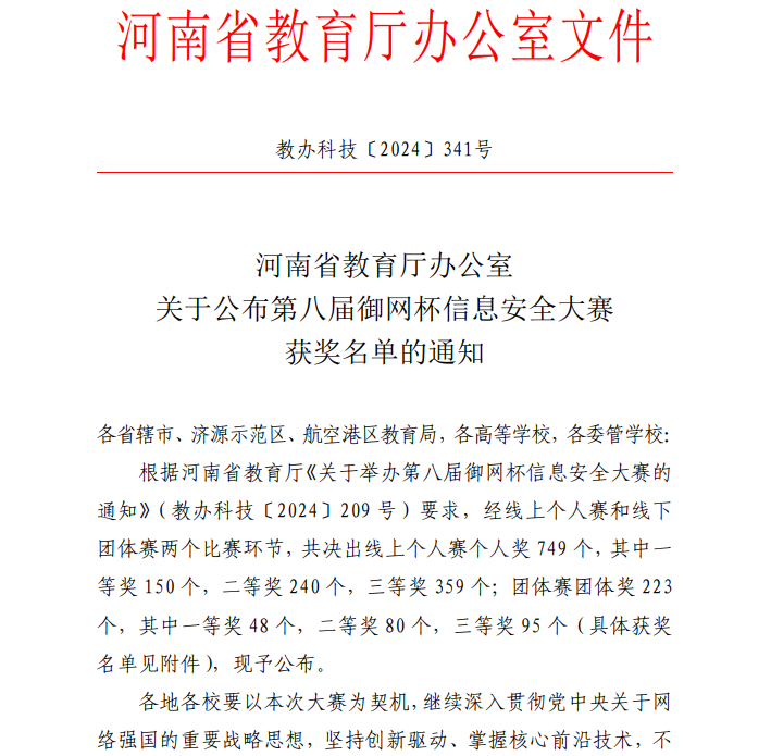11月4日,河南省教育厅办公室下发文件[教办科技〔2024〕341号],公布了第八届“御网杯”信息安全大赛的获奖名单,太阳成tyc7111cc教师荣获“教师组三等奖”。