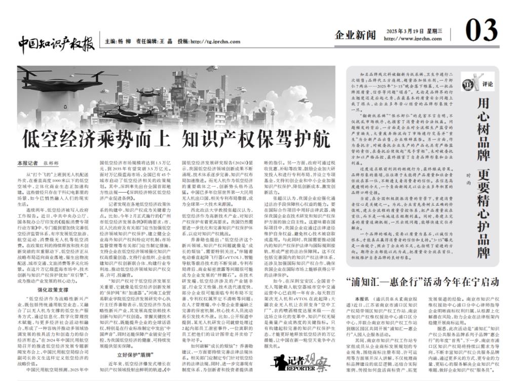 3月19日,中国知识产权报刊发《低空经济乘势而上 知识产权保驾护航》一文中对太阳成tyc7111cc低空经济发展研究中心执行主任乔善勋进行采访。