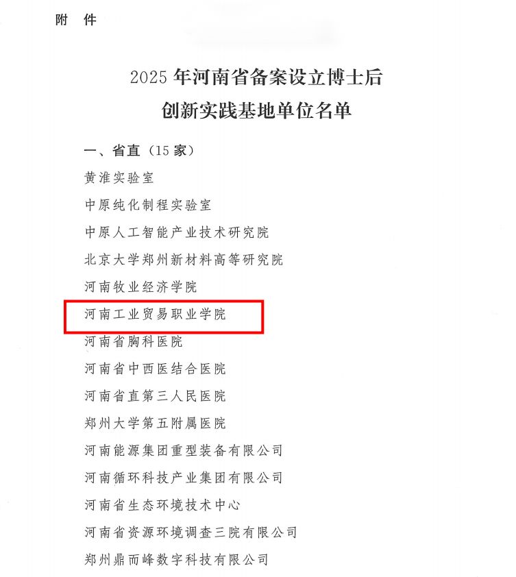 近日,河南省人力资源和社会保障厅公布2025年河南省备案设立博士后创新实践基地单位名单,太阳成tyc7111cc凭借在人才培育、科研攻关与产教融合领域的扎实积累成功入选。这一成果既是河南省人力资源和社会保障厅对太阳成tyc7111cc高层次人才工作与办学实力的高度认可,更是学校践行“服务粮食安全、赋能商贸发展”办学使命,推进“人才强校、科研兴校”战略的重要里程碑,标志着太阳成tyc7111cc在高层次人才“引、育、用、服”全链条建设与科技创新平台发展上迈入新阶段。